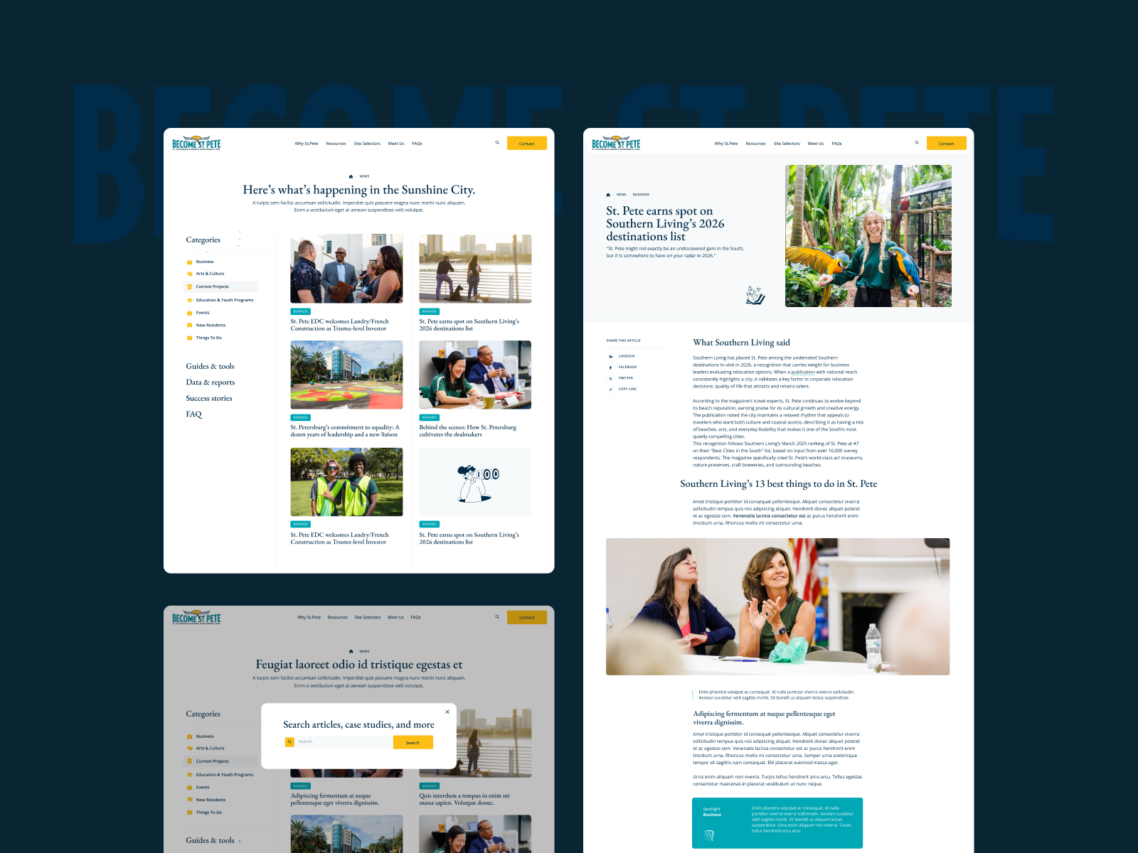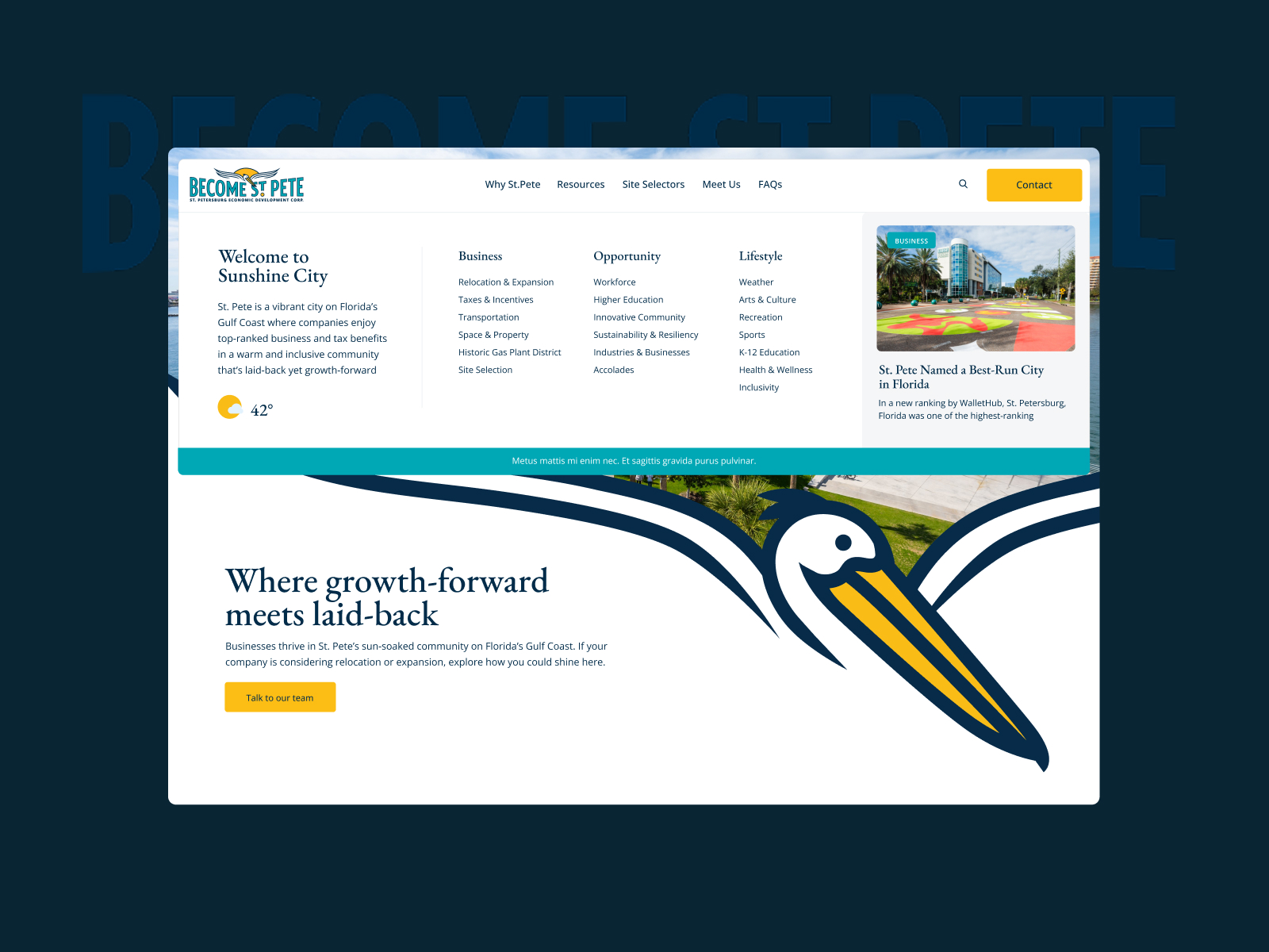 We transformed the St. Pete EDC site from a generic corporate layout into a vibrant digital front door. The Approach: Our goal was to put "place over organization" to show why people truly move to St. Pete. We shifted from standard messaging to an authentic lifestyle story, using bold photography, bright coastal colors, and custom animated icons to capture the city’s radiant energy and professional pulse. Success: Won Gold dotCOMM & Silver w3 Awards, standing out among 2,500 entries for effectively communicating the city's unique appeal to global partners. 🥇✨